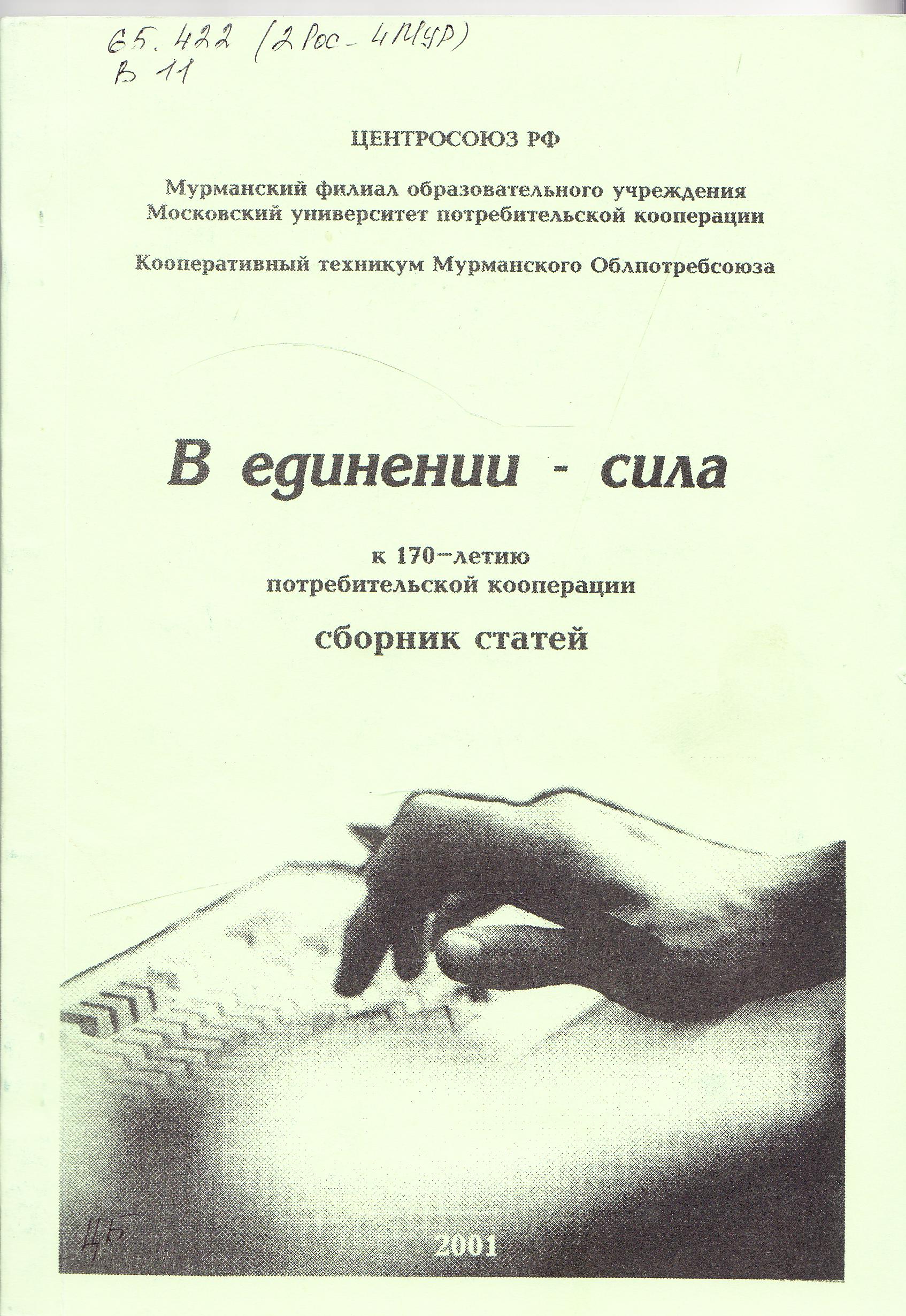 В единении - сила [Текст] : К 170-летию потребительской кооперации : сборник статей / Центросоюз РФ, Мурманский филиал образовательного учреждения МУПК, Кооперативный техникум Мурманского Облпотребсоюза, 2001. - 135, [1] с.